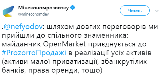 "Путем долгих переговоров мы пришли к общему знаменателю: площадка OpenMarket присоединяется к ProzorroПродажи в реализации всех активов, в частности малой приватизации, имущества обанкротившихся банков, прав аренды и т.д.", - заявил заместитель министра экономики Украины Макс Нефедов.