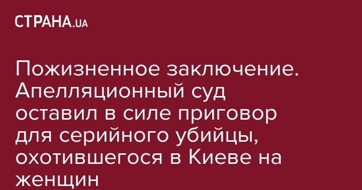 Апелляционный суд Киева оставил без изменений приговор суда в виде пожизненного заключения для орудовавшего в столице серийного убийцы женщин. Об этом сообщил спикер Генеральной прокуратуры Андрей Лысенко на своей странице в Facebook.