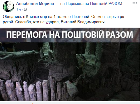 "Говорила с Кличко на 1 этаже о Почтовой. Он мне закрыл рот рукой. Спасибо, что не ударил, Виталий Владимирович", - написала Морина в Facebook.