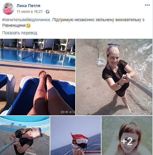 "Докажем всем, что педагоги тоже люди, и наш отдых не должен никого волновать. Я пережив очень много за эти 8 месяцев, научилась отстаивать себя, я уже никого не боюсь, я защищаю свое будущее... Давайте со мной, фото в купальниках на отдыхе с хэштегом #явчительимийвидпочинок и это касается не только педагогов, но и тех, кто не согласен с такими рода увольнениями", - написала Вита Черешневская.