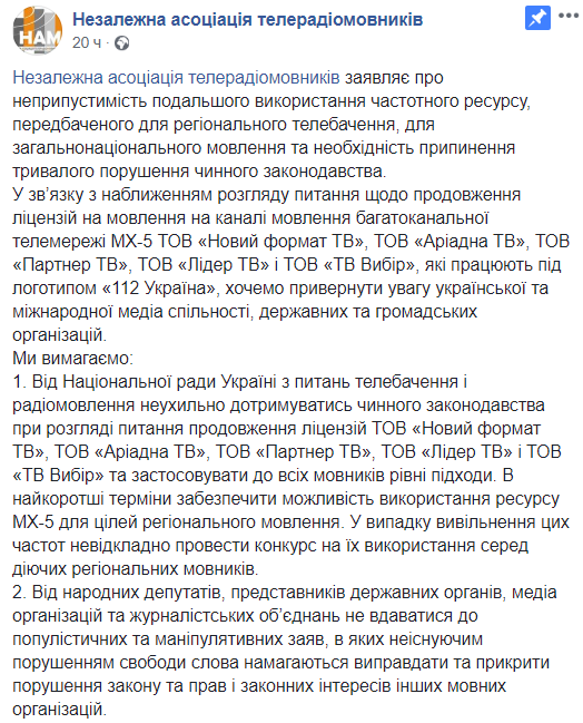 Но и это не последнее совпадение в странностях с украинскими телеканалами. За несколько часов до "блэкаута" 112 Независимая ассоциация телерадиовещателей (в телевизионных кругах считается дружественной организаций для руководства Нацсовета по телевидению и радиовещанию) потребовала лишить этот канал региональных частот.