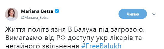 "Жизнь политзаключенного Балуха под угрозой. Требуем от РФ доступа укр. врачей и немедленного освобождения #FreeBalukh", - написала Беца в twitter.