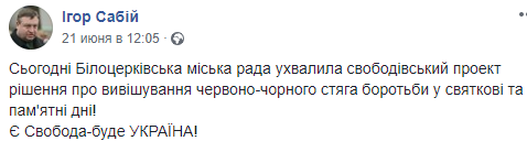 Так глава ВО "Свобода" в Киевской области Игорь Сабий на своей странице в Facebook сообщил, что красно-черный флаг будет вывешиваться на здании Белоцерковского городского совета в праздничные и памятные дни.