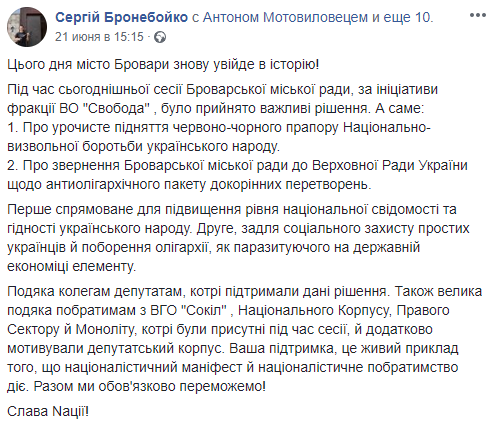 Вывешивать красно-черный флаг будут также и в Броварах. Аналогичное решение также сегодня принял горсовет Броваров. Об этом в Facebook сообщил депутат горсовета от фракции "Свобода" Сергей Бронебойко.