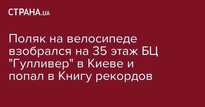 В субботу, 23 июня, польский велосипедист-экспериментатор, пятикратный рекордсмен Книги Гиннеса Кристиан Герба, установил в Киеве новый рекорд. Спортсмен поднялся на своем байке на 35 этаж бизнес-центра "Гулливер" (высота - 161 метр).