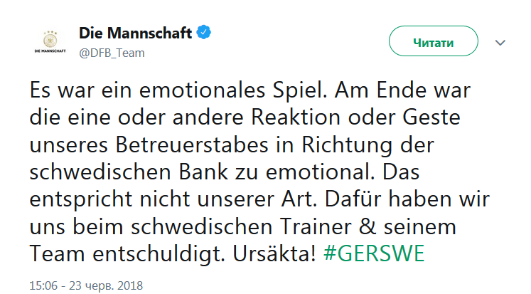 Реакция Немецкого футбольного союза (DFB) не заставила себя ждать. Немцы официально извинились перед сборной Швеции за такое неджентльменское поведение футболистов. Извинения опубликованы в Twitter DFB.