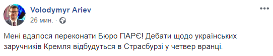 "Мне удалось убедить Бюро ПАСЕ! Дебаты касательно украинских заложников Кремля состоятся в Страсбурге в четверг утром", - отметил он.
