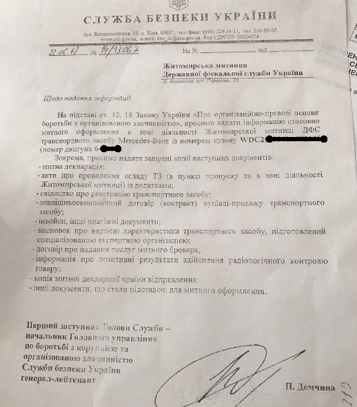 В запросе СБУ просит предоставить информацию об автомобиле Mercedes GLE 350D, который в 2017 году приобрела жена премьера - Елена Гройсман. В частности, таможенную декларацию, акты о проведении осмотра ТС, свидетельство о регистрации транспортного средства, инвойсы и другие платежные документы, договор о предоставлении услуг таможенного брокера и тому подобное.