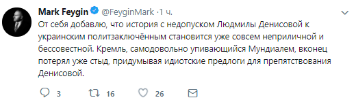 "Он тоже ее очень ждет. От себя добавлю, что история с недопуском Людмилы Денисовой к украинским политзаключенным становится уже совсем неприличной и бессовестной. Кремль, самодовольно упивающийся чемпионатом мира, вконец потерял уже стыд, придумывая идиотские поводы для препятствования Денисовой", - резюмировал Фейгин.