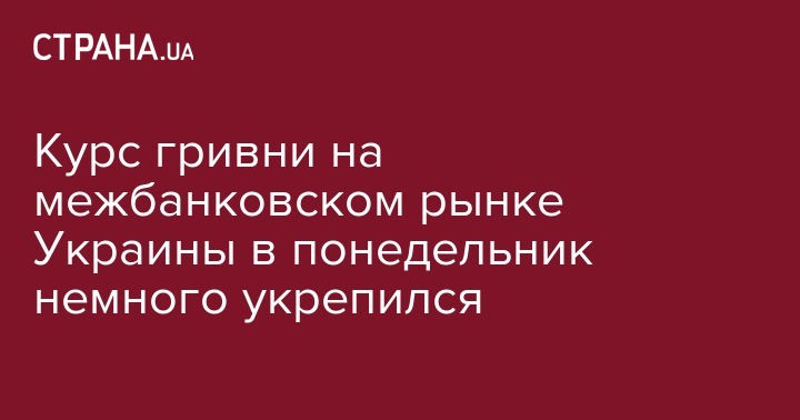Курс гривни на межбанковском валютном рынке в понедельник укрепился до 26,1875 грн/$1 с 26,21 грн/$1 в предыдущий рабочий день, сообщили агентству "Интерфакс-Украина" дилеры коммерческих банков.