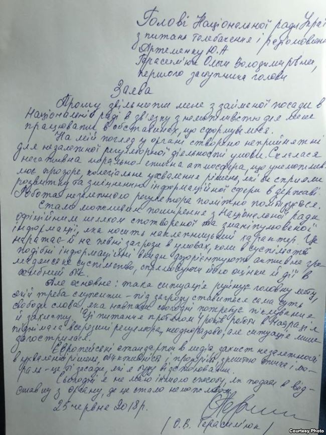 Кроме того, она предоставила фотокопию своего заявления (об увольнении – Прим. ред), в котором отметила "созданные неприемлемые для независимой регуляторной деятельности условия".