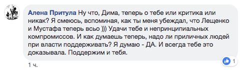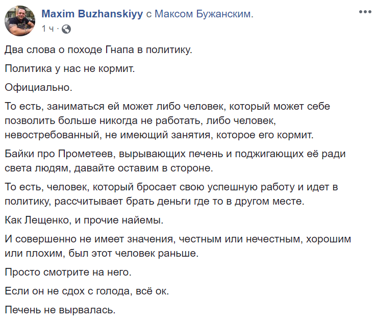 "Горячо и искренне поддерживаю решение Dmytro Gnap пойти в политику. Это естественный поворот в жизни любого, кто устал рассказывать, кто виноват и не согласен с тем, как все устроено.
