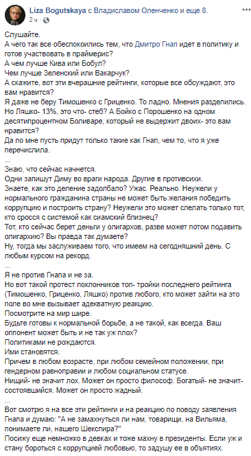 Да по мне пусть придут только такие, как Гнап, чем то, что я уже перечислила", – пишет активистка Лиза Богуцкая.