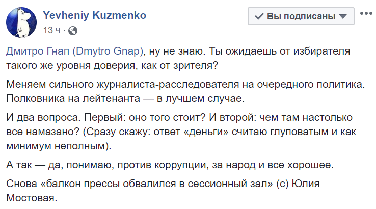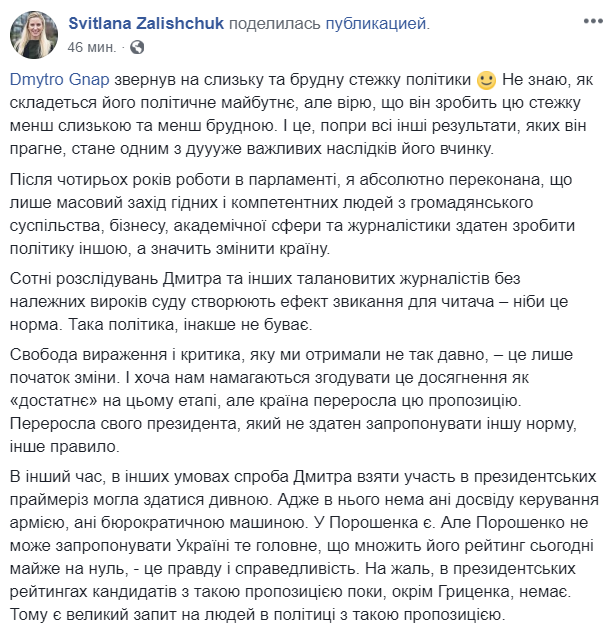 "Грустное и ожидаемое заявление Дмитрия Гнапа о том, что он покидает журналистику и уходит в политику. Грустное, потому что Дима был хорошим журналистом. Въедливым. Принципиальным. Самовдохновляющимся. Талантливым, как бы кто ни оценивал его творчество. Он выпил много крови у прошлой и текущей власти. И крепкой слоновой костью стоял поперек горла у многих злодеев современности. Дима сделал много ярких сюжетов и разоблачений, которые стали эпиграфами для массы неудавшихся политиков.