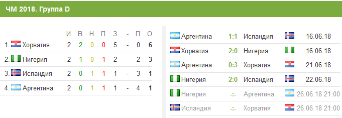 Как видим по таблице, Нигерия пройдет дальше если обыграет "альби селесте". Африканцы могут выйти из группы, и в том случае если сыграют вничью с Месси и Со, а Исландия проиграет или сыграет вничью с хорватами Хорватии.