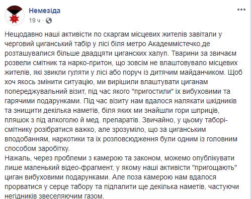 Представители националистичекой организации "Немезида" утверждают, что совершили вооруженное нападение на лагерь ромов вблизи станции метро "Академгородок". По их словам, здесь располагалось около двадцати палаток этого нацменьшинства. Об этом радикалы написали в на своей странице в Facebook.