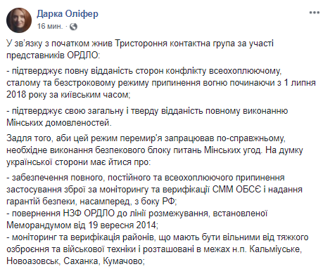 Решение о перемирии в связи с началом жатвы  приняла Трехсторонняя контактная группа с участием представителей ОРДЛО, написала она