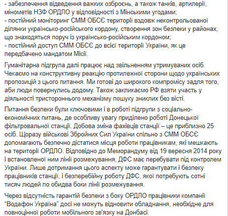 По информации Олифер гуманитарная подгруппа продолжает работать над освобождением удерживаемых лиц.  Вопросы безопасности были ключевыми и в работе подгруппы по социально-экономическим вопросам, где особое внимание уделено работе Донецкой фильтровальной станции. Кроме того понимался вопрос, что из-за отсутствия гарантий безопасности со стороны ОРДЛО работники компании "Водафон Украины" до сих пор не могут восстановить оборудование, необходимое для полноценной работы мобильной связи на Донбассе.