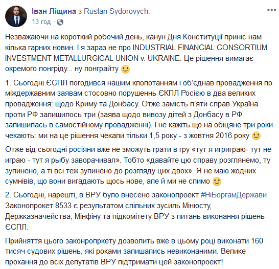 "ЕСПЧ согласился по нашему ходатайству и объединил производство по межгосударственным заявлениям относительно нарушений Россией в два больших производства: по Крыму и Донбассу. Так что вместо пяти дел Украины против РФ осталось три (заявление по вывозу детей из Донбасса в РФ осталось в самостоятельном производстве)", - написал Лещина.