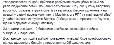 На Донецком направлении противник активизировал боевые действия и применял по нашим позициям преимущественно гранатометы, крупнокалиберные пулеметы и стрелковое оружие, а на отдельных направлениях зафиксирован огонь из БМП. Под прицельным огнем находились защитники Марьинки, Авдеевки, Южного, опытно и Новомихайловка", - говорится в сообщении.