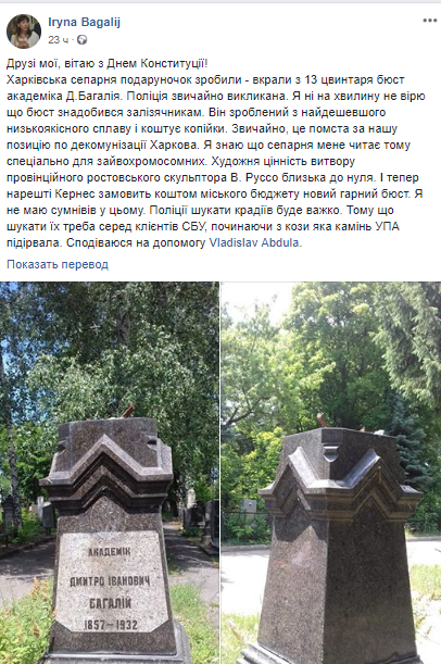 В Харькове неизвестные похитили бюст с могилы историка Дмитрия Багалия на кладбище №13 по улице Пушкинской, 108 в Харькове. Об этом написала в Facebook праправнучка ученого, врач и общественный активист Ирина Багалий.