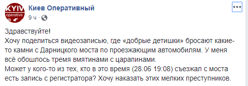 Водитель, который записал это видео, написал, что "добрые детишки" бросают какие-то камни с Дарницкого моста по проезжающим автомобилям. У меня всё обошлось тремя вмятинами с царапинами".