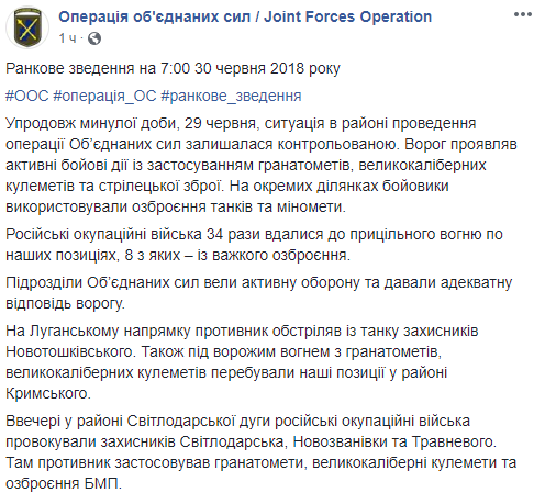 Противник 34 раза обстреливали украинские позиции, 8 из которых - из тяжелого вооружения.