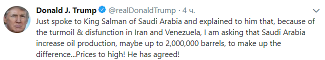 "Только что поговорил с королём Саудовской Аравии Салманом и объяснил ему, что из-за беспорядков и нарушений в Иране и Венесуэле я прошу увеличить добычу нефти, возможно, до двух двух миллионов баррелей, чтобы компенсировать разницу... Он согласен!" — заявил американский лидер.