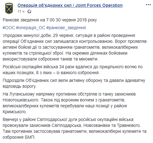 Впрочем, еще утром 30 июня штаб ООС на Донбассе докладывал о 34 случаях прицельного огня по позициям украинских военных. 8 обстрелов было из тяжелого вооружения.