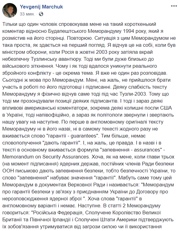 "Во-первых в англоязычном оригинале текста Меморандума ни в его названии, ни в самом тексте ни разу не употребляется слово "гарантии - guarantees". Тем более, нет словополучення "дают гарантии" ... И в названии, и в тексте в основном используется формула "заверения - assurances"", - пишет Марчук.