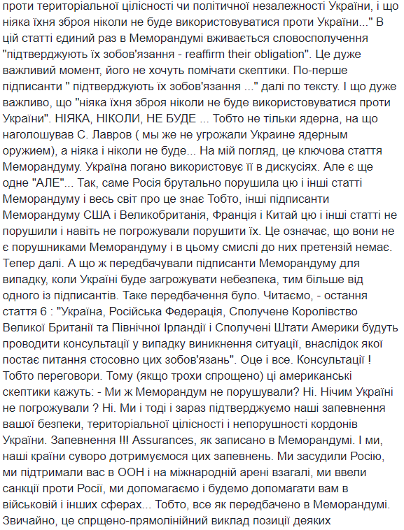 "Именно Россия грубо нарушила эту и другие статьи Меморандума ... другие подписанты Меморандума США и Великобритания, Франция и Китай эту и другие статьи не нарушили и даже не угрожали нарушить их. Это означает, что они не являются нарушителями Меморандума и в этом смысле к ним претензий нет", - объясняет эксперт.