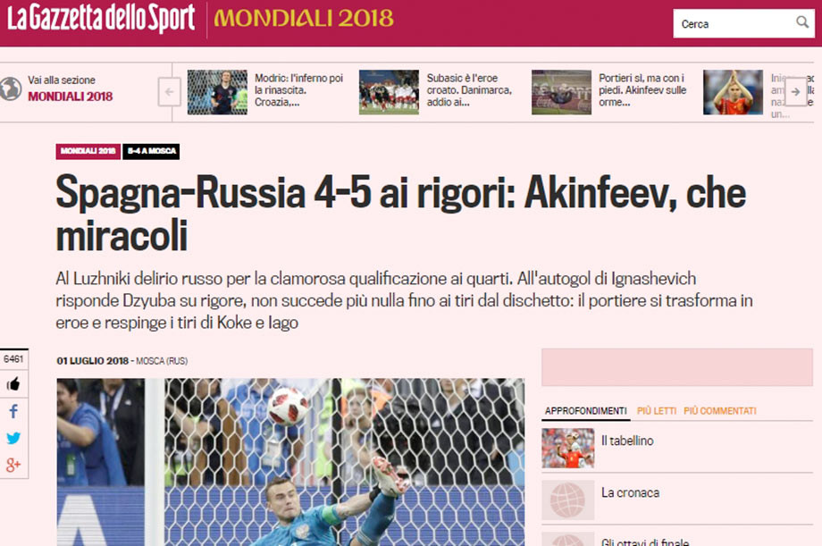 "На постере чемпионата мира в России изображен лучший игрок в ее истории - Лев Яшин. Не кто-то, а вратарь. Вратарь! Нынешний вратарь, Игорь Акинфеев, никогда не считался его преемником - наоборот, долгое время на него сыпалась критика. Однако именно его сейв в матче с испанцами войдет в мифологию чемпионатов мира, ведь он вывел Россию в четвертьфинал турнира и выбил очередного гранда", - отмечает итальянская La Gazzetta dello Sport.