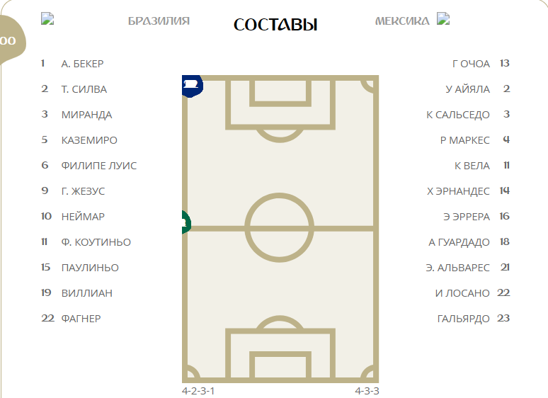 16.00 Стартовые составы. Как видим, Мексика внезапно с первых минут вывела капитана команды Рафаэля Маркеса. Видимо со старта бросают на Бразилию лучшие силы, чтобы устроить футбольный блицкриг.