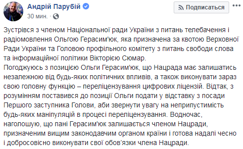 Спикер Верховной Рады Андрей Парубий объяснил отставку заместителя председателя главы Нацсовета по вопросам телевидения и радиовещания Ольги Герасимюк. По его словам, она была вызвана "желанием избежать манипуляций в процессе перелицензирования".