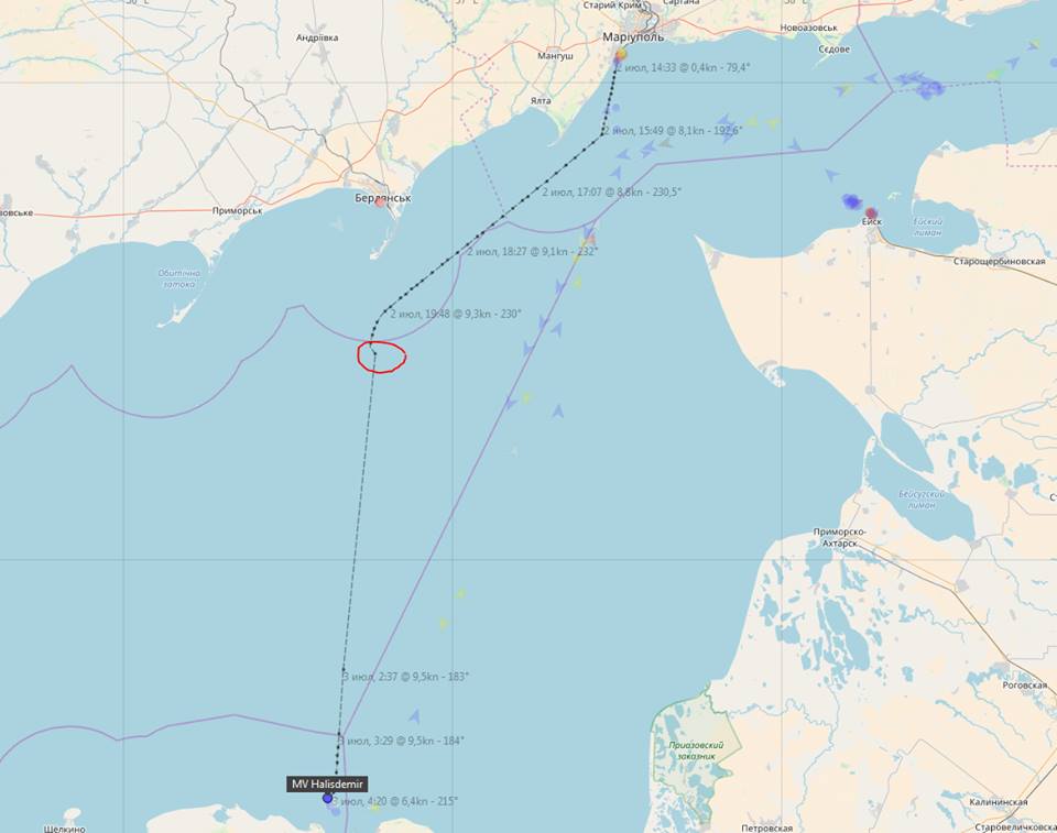 В ночь на 3 июля, в Азовском море к югу от Бердянска, почти в одной точке корабль береговой охраны ФСБ России задержал два судна, следовавших в Мариуполь и обратно.