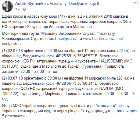 По его данным, первое судно было задержано 2 июля ориентировочно в 20:30 на расстоянии 12 морских миль (22 км) к югу от Бердянской косы.