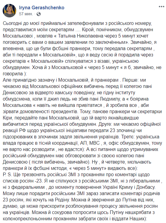 Вице-спикер парламента Ирина Геращенко заявила, что ей в приемную позвонили неизвестные, которые представились помощниками российского омбудсмена Татьяны Москальковой.