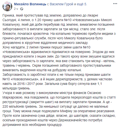 Волынец 3 июля говорил с исполняющей обязанности министра финансов Оксаной Маркаровой. Она сообщила, что согласовала перераспределение средств из статьи реструктуризации (закрытие шахт) на выплату зарплаты горнякам, а это 220 миллионов гривен.