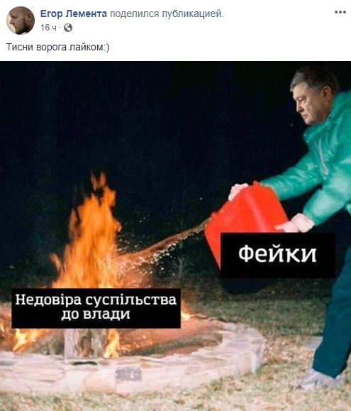 Егор Лемента публикует карикатуру на Порошенко, где президент льет фейки на костер недоверия к власти.