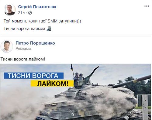 Пользователь Facebook Сергей Плахотнюк шутит: "Когда твои SMM затупили - жми врага лайком".