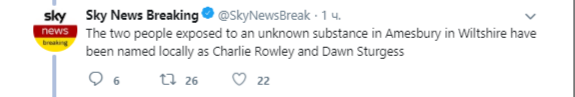 Состояние двух отравленных людей в городе поблизости Солсбери, где ранее отравили Скрипелей, остается критическим, однако новых потерпевших нет. Об этом сообщает Sky News в Twitter.