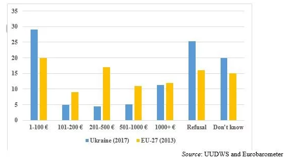 По данным исследования, 30% опрошенных получают менее 100 евро в месяц. Существенно меньшее количество получает от 100 до 300 евро, от 300 до 500 евро и от 500 до 1000 евро. Вместе с тем, подавляющее большинство украинцев, которые получают "конвертную" зарплату, хотели бы, чтобы зарплата выплачивалась официально.