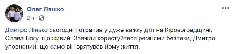 "Дмитрий Линько сегодня попал в очень тяжелое ДТП на Кировоградщине. Слава богу, что живой! Всегда пользуйтесь ремнями безопасности. Дмитрий уверен, что именно они спасли ему жизнь", написал на своей странице в Facebook Олег Ляшко.