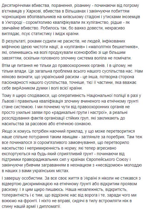 "Искренне надеюсь, что оперативность Национальной полиции, как при случае во Львове, и правильная квалификация преступления, совершенного на этнической почве, станет системой. И мы начнем слышать от правоохранительных органов не просто уклончивые заявления о "радикальных группах и настроениях", а реальные расследования фактов организации групп, призывающих к насилию по расовому или этническому признаку", – сказал депутат.