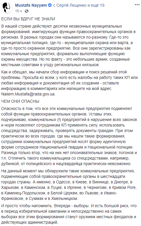 "В нашей стране действуют десятки незаконных муниципальных формирований, имитирующих функции правоохранительных органов в регионах. В разных городах они называются по-разному. Где-то это "муниципальная полиция", где-то - "муниципальная охрана" или "варта", а где-то просто "охранное предприятие". Все они зарегистрированы как коммунальные предприятия, формально выполняющие функцию охраны имущества. Но по факту это небольшие армии, созданные местными советами в угоду региональным князькам", – возмущается нардеп.