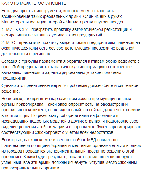 "Насколько мне известно, сейчас МВД совместно с Национальной полицией Украины и местными органами власти в одном из городов проводится экспериментальный проект по решению этой проблемы. Каким будет результат, покажет время; но если он будет успешный, все эти армии должны исчезнуть, уступив место законным правоохранительным органам".
