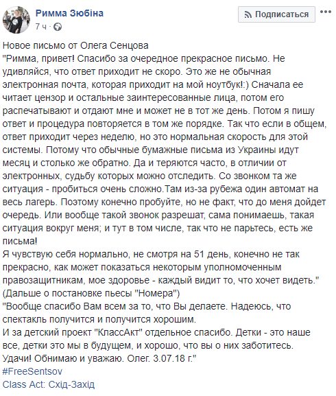 Украинский режиссер Олег Сенцов, который голодает почти два месяца в российской колонии, написал письмо актрисе Римме Зюбиной, в котором рассказал о своем самочувствии.