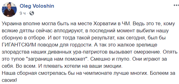 "Украина вполне могла быть на месте Хорватии в ЧМ. Ведь это те, кому всякие дятлы сейчас аплодируют, в последний момент выбили нашу сборную в отборе. И вот тогда такой результат, как сегодня, был бы гигантским поводом для гордости. А так это жалкое зрелище злорадства наших диванных ура-патриотов вызывает омерзение. Опять это тупое "заграница нам поможет". Смешно и глупо. Они играют за себя. Во всем. И плевать хотели на ваши эмоции.