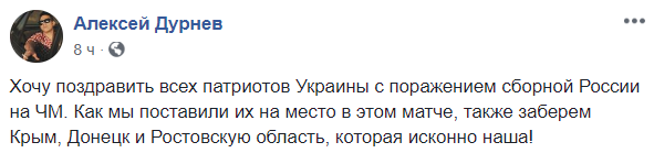 "Хочу поздравить всех патриотов Украины с поражением сборной России на ЧМ. Как мы поставили их на место в этом матче, также заберем Крым, Донецк и Ростовскую область, которая исконно наша!", - троллит всеобщую эйфорию шоумен Алексей Дурнев.