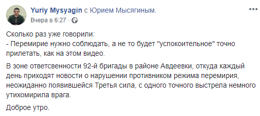 По словам Мысягина, запечатленные на видео действия происходили в зоне ответственности 92-й бригады в районе Авдеевки, откуда каждый день приходят новости о нарушении противником режима перемирия.